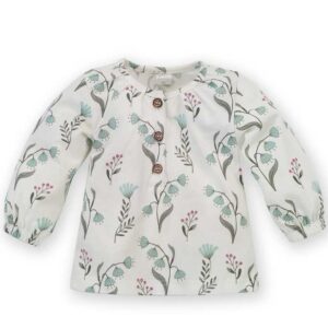 Bawełniana bluzka z długim rękawem w kolorze beżowym. Bluzka zapinana jest na lewym ramieniu na bezniklowe zatrzaski to ułatwia ubieranie dziecka. Nadruk zwierzątek i roślin został wykonany trwałą bezpieczną metodą farb wodnych a ściągacze na mankietach i dekolcie dodają ubranku uroku.