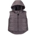 Pikowana kamizelka z kapturem w szarym, lekko połyskującym kolorze.