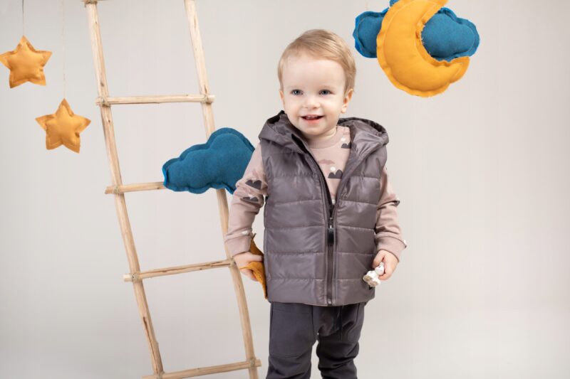 Pikowana kamizelka z kapturem w szarym, lekko połyskującym kolorze. Po bokach ma dwie kieszonki, idealne na dziecięce skarby, znalezione podczas spacerów. Z przodu na dole, po lewej stronie, umieszczono ozdobną naszywkę z górami. Tył kamizelki jest nieco dłuższy, dzięki czemu będzie lepiej chronić plecy, gdy dziecko ukucnie. Kamizelka rozpinana jest na całej długości na wygodny suwak, co ułatwia ubieranie malucha. Zamek błyskawiczny zabezpieczony jest plisą od wewnątrz oraz na górze, żeby nie urazić dziecka w czasie zasuwania. Luźny fason nie krępuje ruchów dziecka i zapewnia mu komfort podczas zabawy oraz codziennych aktywności. Doskonale komponuje się z pozostałymi ubraniami kolekcji Dreamer.