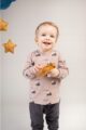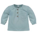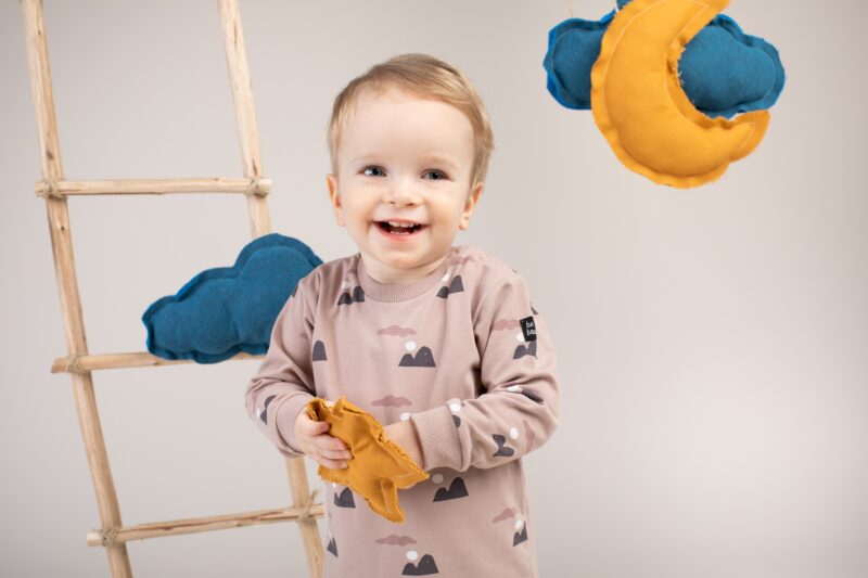 Bawełniana bluzka z długim rękawem w ciekawy wzór gór i chmurek. Nadruk wykonany został sprawdzoną metodą farb wodnych, która zapewnia mu trwałość nawet po wielu praniach. Na lewym ramieniu umieszczono małą naszywkę z napisem BE BRAVE. Bluzka przy szyi oraz na dole rękawów została wykończona ściągaczem. Do rozmiaru 92 włącznie bluzka jest rozpinana na lewym ramieniu, co ułatwia ubieranie i rozbierania dziecka. Zatrzaski wykonano z bezpiecznego tworzywa, bez dodatku niklu. Doskonale komponuje się z pozostałymi ubrankami kolekcji Dreamer.