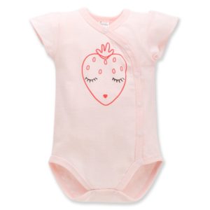 Różowa, bawełniana bluzka dla dziewczynki z truskawką z przodu. Idealna na wiosnę i lato. Ozdobnie wywinięte rękawki dodają uroku. Nadruk wykonano bezpieczną metodą farb wodnych. Możliwość rozpinania koszulki na lewym ramieniu ułatwia ubieranie dziecka. Zatrzaski wykonano z antyalergicznego, bezniklowego tworzywa. Bluzkę można dowolnie łączyć z innymi ubrankami z kolekcji Love&Love, tworząc unikatowe, letnie stylizacje.