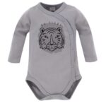 Body niemowlęce z długim rękawem w kolorze ecru, wykonane z wysokiej jakości 100% bawełny. Ubranko posiada wzór przypominający tygrysie pręgi, wykonany trwałą bezpieczną metodą farb wodnych. Z tyłu na karku umieszczono naszywkę z napisem „LE TIGRE” a na lewym boku i w kroku ubranko zapinane jest na bezpieczne bezniklowe zatrzaski. Wzór, odpowiedni krój i miękka bawełna sprawiają, że warto o nim pamiętać kompletując wyprawkę maluszka. Doskonale komponuje się z pozostałymi ubrankami kolekcji Le Tigre.