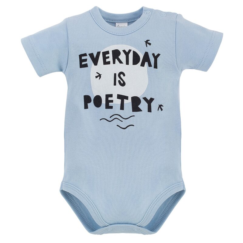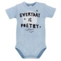 Body krótki rękaw w kolorze niebieskim wykonane z wysokiej jakości 100% bawełny. Z przodu umieszczono ozdobny napis EVERYDAY IS POETRY na tle jasnego słońca i fal. Nadruk został wykonany trwałą bezpieczną metodą farb wodnych. Body rozpinane jest na lewym ramieniu oraz w kroku na bezniklowe zatrzaski, to ułatwia ubieranie dziecka. Doskonale sprawdzi się samo w ciepłe wiosenno – letnie dni jak i pod bluzę w nieco chłodniejsze dni jesieni.