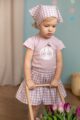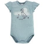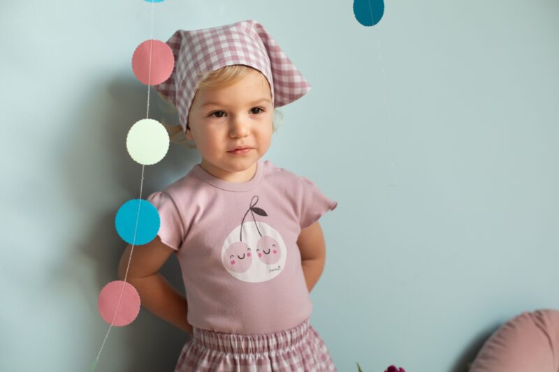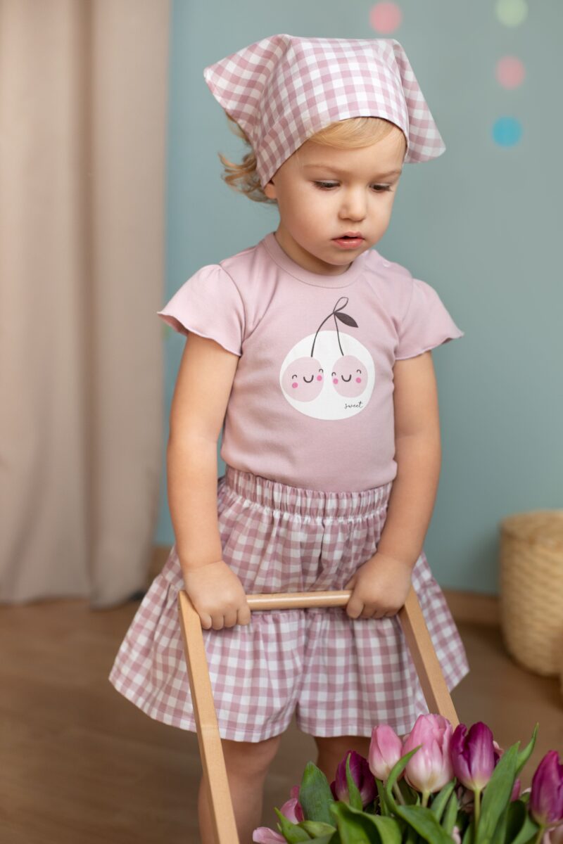 Body posiada z przodu nadruk wisienek z drobnym napisem SWEET, wykonany bezpieczną metodą farb wodnych. Rękawki posiadają marszczenie. Body zapinane jest na lewym ramieniu oraz w kroku na bezniklowe zatrzaski. Takie body to niezbędny element wyprawki małej dziewczynki.