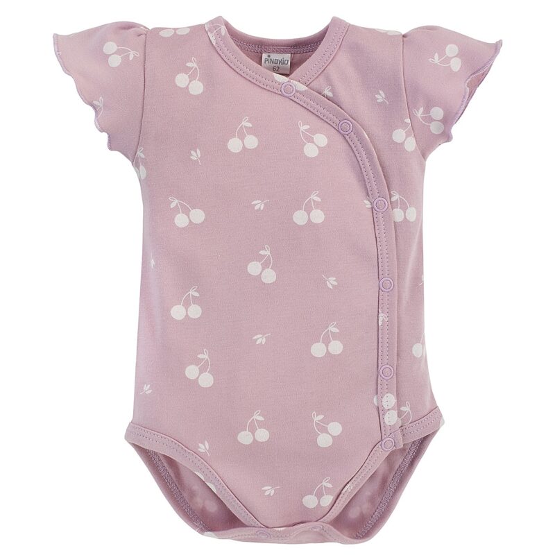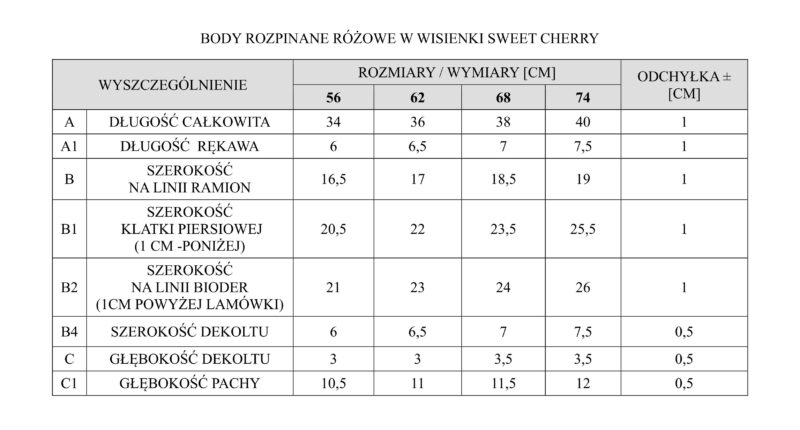 Body posiada nadruk uroczych wisienek wykonany bezpieczną metodą farb wodnych. Z tyłu, na wysokości karku, umieszczono ozdobną naszywkę z napisem SWEET CHERRY. Rękawki posiadają marszczenie. Ubranko rozpinane jest na całej długości na bezniklowe napy co ułatwia bardzo ubieranie i przewijanie dziecka. Takie body to niezbędny element wyprawki małej dziewczynki.