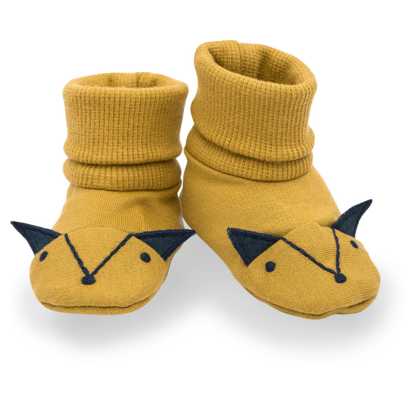 Buciki niemowlęce w modnym kolorze curry, z uroczą aplikacją lisków.