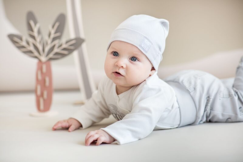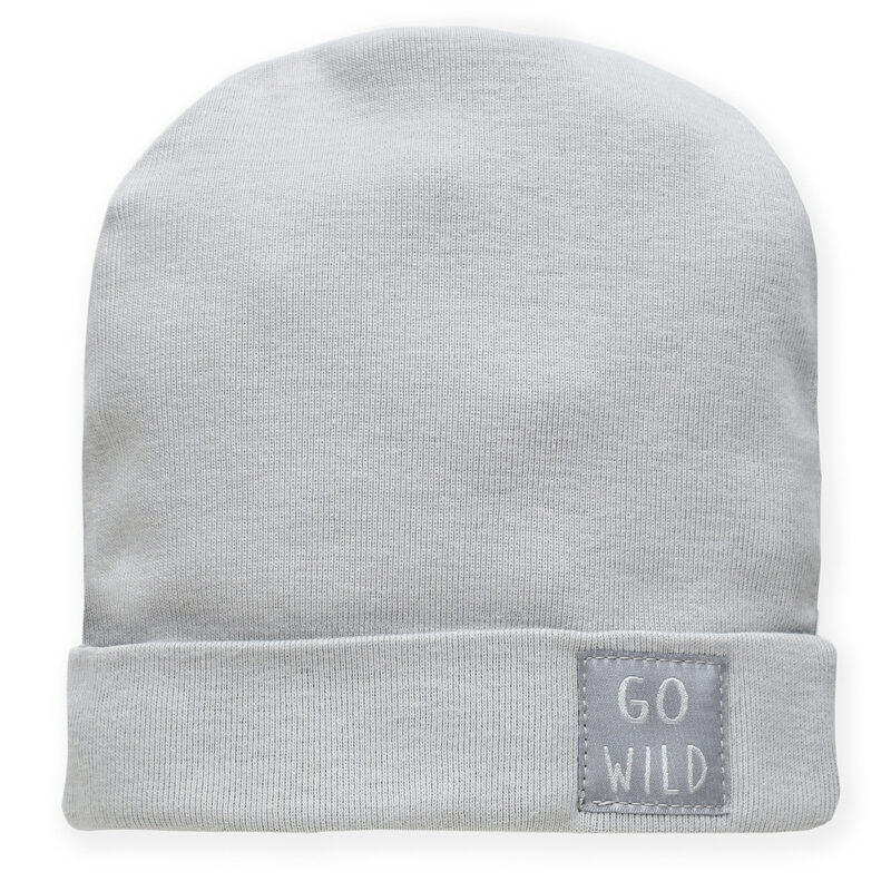 Czapka niemowlęca w szarym kolorze wykonana z wysokiej jakości 100% bawełny. Z przodu czapki znajduje się ozdobna naszywka z napisem Go Wild. Czapeczka dobrze przylega do dziecięcej główki, zapewniając ochronę uszu przed wiatrem. Idealnie sprawdzi się również jako czapeczka po kąpieli. Warto o niej pamiętać kompletując wyprawkę dla swojego dziecka.