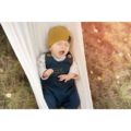 Bawełniane ogrodniczki dla malucha z nogawkami ozdobnie wywijanymi.
