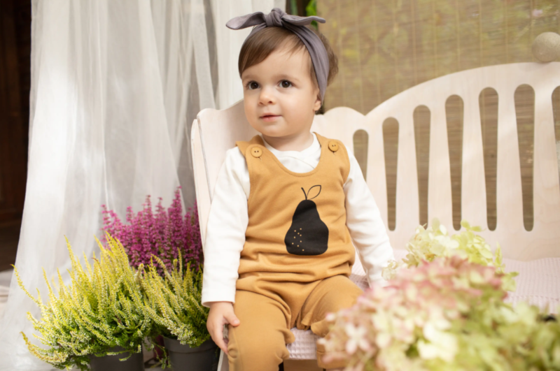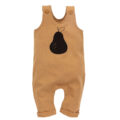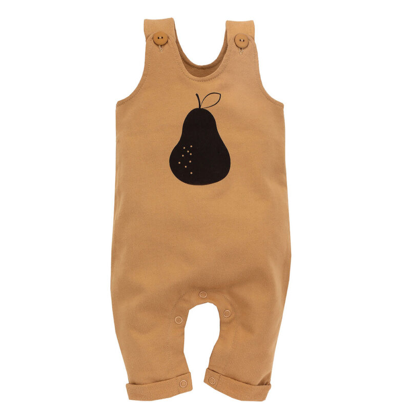 Ogrodniczki bawełniane w kolorze karmelowym. Ogrodniczki zapinane są w kroku na bezpieczne bezniklowe zatrzaski a na ramionach na ozdobne guziki to ułatwia znacznie ubieranie dziecka. Z przodu znajduje się motyw czarnej gruszki, który dodaje ubranku charakteru. Miękka bawełna oraz odpowiedni krój dają dziecku komfort podczas codziennych aktywności. Ogrodniczki doskonale chronią plecy dziecka podczas chłodniejszych dni. Sprawdzą się idealnie podczas spacerów. Warto o nich pamiętać kompletując wyprawkę do żłobka czy przedszkola. Doskonale komponują się z pozostałymi ubrankami kolekcji Tres Bien.