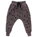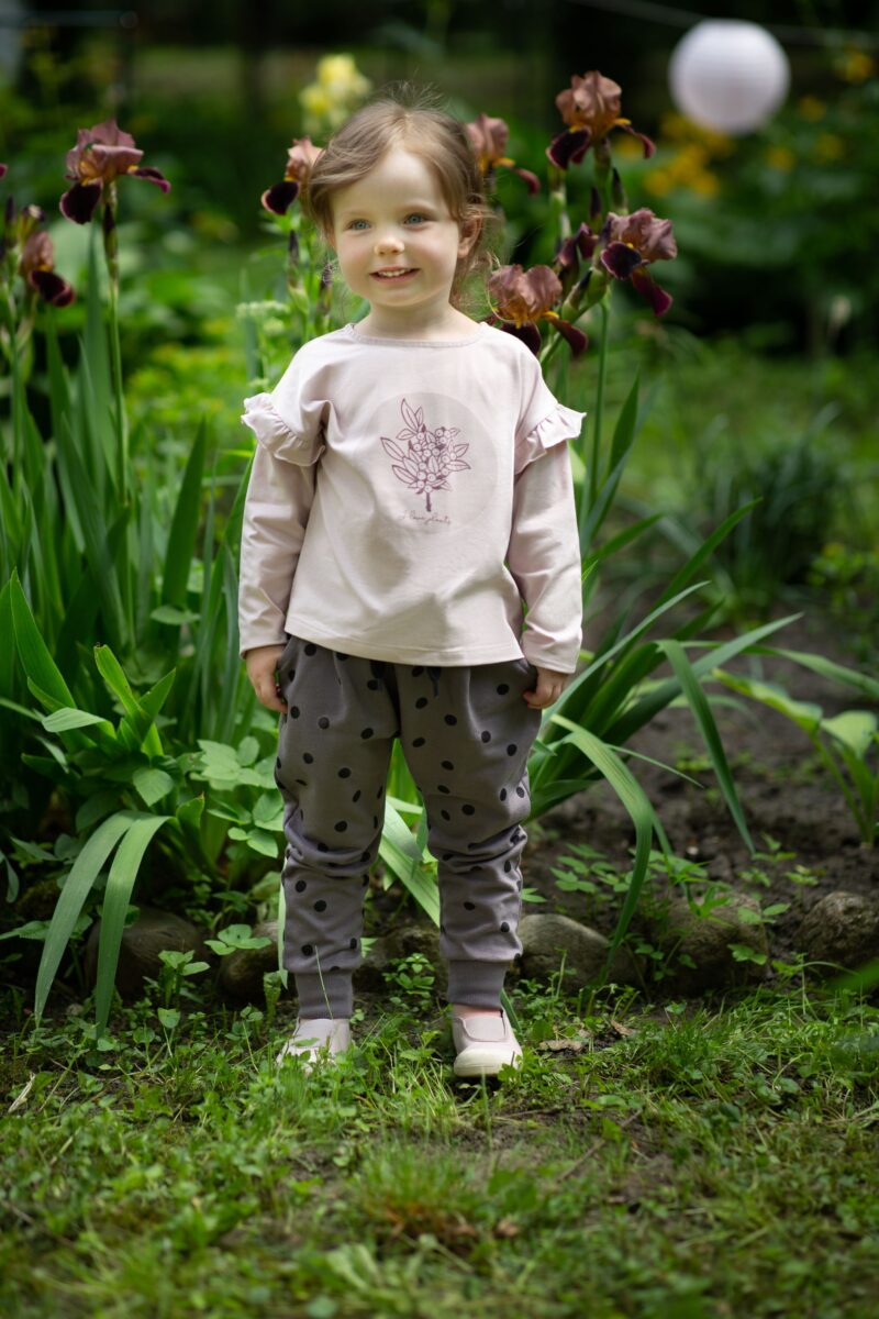 Spodnie na całości posiadają wzór w groszki. Charakterystyczne dla spodni typu pumpy  jest obniżony nieco krok. W pasie wszyto szeroki nieuciskający ściągacz uzupełniony gumką dzięki temu pumpy utrzymują się w odpowiednim miejscu. Dodatkowo sznurkami można regulować szerokość w pasie, a ściągacze przy nogawkach pomagają dopasować spodnie do wzrostu. Luźny fason spodni idealnie sprawdzi się podczas aktywnych zabaw w przedszkolu czy na spacerach. Spodnie doskonale komponują się z grafitową bluzą Julia w groszki oraz pozostałymi ubrankami z tej kolekcji.