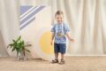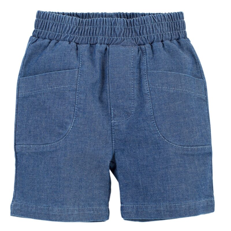 Spodenki krótkie z cienkiego niebieskiego jeansu. W pasie wszyta jest guma, która utrzymuje ubranko w odpowiednim miejscu, nie uciskając tym samym dziecka w brzuszek. Z przodu umieszczono dwie kieszonki, idealne na dziecięce skarby. Po środku spodenki ozdobione są imitacją rozporka. Odpowiedni fason nie krępuje ruchów dziecka przy zabawie czy nauce raczkowania.