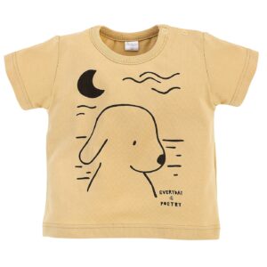 T-shirt dziecięcy w modnym kolorze rdzawego brązu. Wykonany z wysokiej jakości bawełny 95% oraz elastan 5%. T-shirt posiada ozdobny nadruk łosia z przodu, wykonany bezpieczną trwałą metodą farb wodnych. W rozmiarach 62-92, na lewym ramieniu umieszczono wygodne, bezniklowe zatrzaski, to ułatwia ubieranie dziecka. Doskonale komponuje się z leginsami czarnymi Happy Day.
